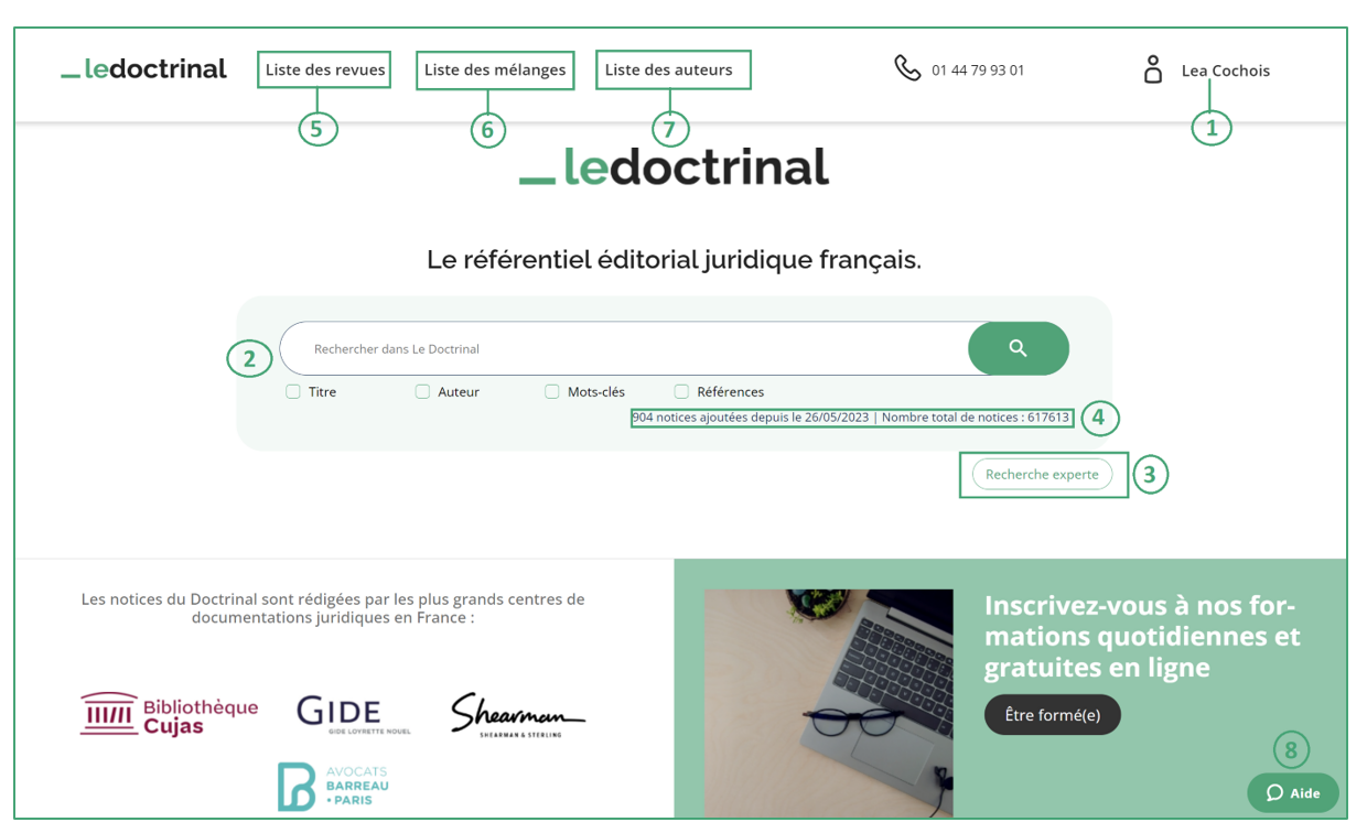Cette page d'accueil est accessible à tout moment en cliquant sur le logo Le Doctrinal en haut à gauche de l'écran.